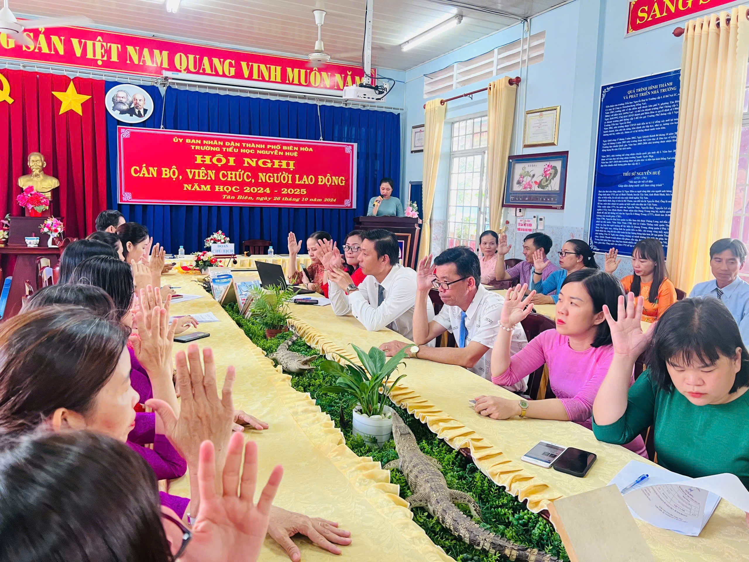 Sáng ngày 26/10/2024, trường tiểu học Nguyễn Huệ đã tổ chức thành công Hội nghị cán bộ - viên chức - người lao động năm học 2024-2025. Hội nghị được tổ chức nhằm tổng kết, đánh giá những kết quả đã đạt được trong năm học 2023-2024, đồng thời đề ra phương hướng nhiệm vụ năm học 2024-2025.